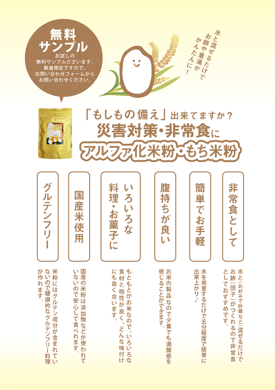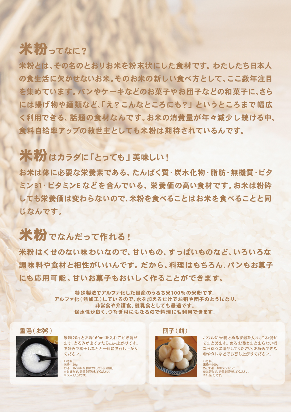 お米やもち米などを特殊製法で熱加工し粉末加工を行うα化粉末加工承ります。非常食・離乳食・介護職に最適なアルファ化米粉・アルファ化もち米粉を作れます。加工例